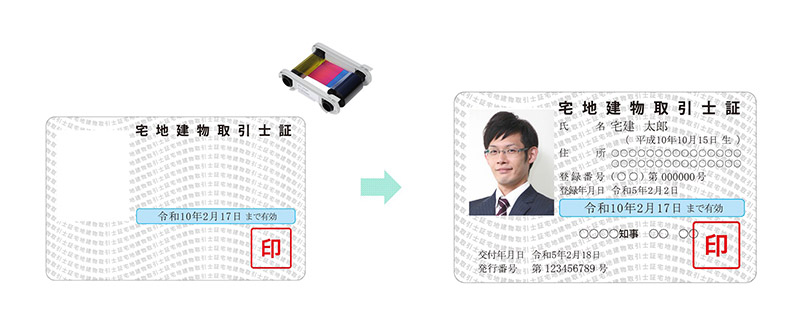 宅建士証向けカードは決められているレイアウトをあらかじめプレ印刷カードで、カードを製造(弊社で承ります)し、1枚1枚内容が異なる可変項目をカードプリンタで印刷します。